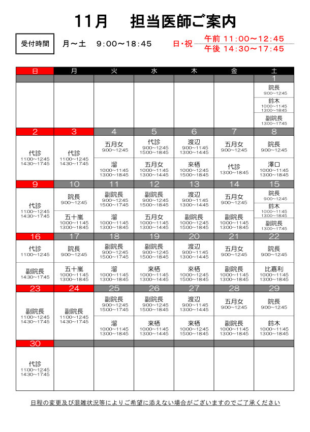 都合により、副院長の診察をお休みさせていただきます。